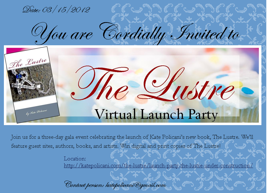 Just choose one of the ideas I posted on the party construction site (dropdown under “The Lustre” page above) and reply or email me with your choice. If you’re a fast reader I can still send you a review copy to pre-review!