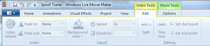 - Windows Live Movie Maker has lots of special controls just for video. I had to pay attention to the volume of each clip and I adjusted the length of the clip using the controls (they highlight as soon as you click on a loaded video clip in the top tabs.) Some videos were louder than others and some had inappropriate sounds I had to avoid by starting after them or ending before. Here is a photo: