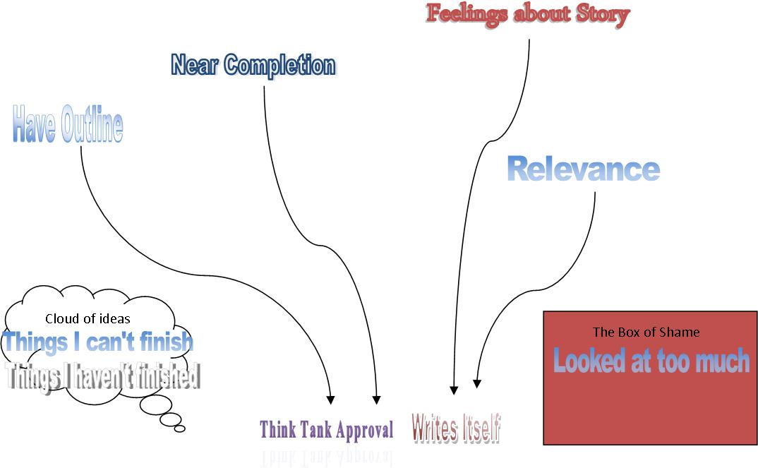A story doesn’t get written because it is in the Box of Shame, which means I’ve overdone it for myself and dislike the story because it is Abodid (this is a very appropriate baby word for “hateful” coined by my son Corbin the Philosopher at age 18 months). The rest of the unfinished rabble exist in the idea cloud, which means they have at least a few sentences to remind me of the concept. These could be one of the four completion categories some day if they eat their Wheaties.